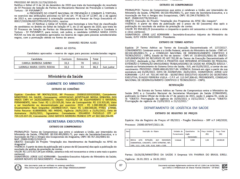 A Associação Hospitalar Nossa Senhora dos Anjos e a União, por intermédio do MINISTÉRIO DA SAÚDE, celebrar Convênio, registrado na Plataforma +Brasil, sob o n. 904763/2020, regendo-se pelo disposto na Lei Complementar nº 101, de 04 de maio de 2000, na Lei nº 8.666, de 21 de junho de 1993, no que couber, na Lei de Diretrizes Orçamentárias do exercício de 2020 (Lei 13.898, de 11 de novembro de 2019), no Decreto Federal no nº 93.872, de 23 de dezembro de 1986, Decreto Federal nº 7.983, de 8 de abril de 2013, Decreto nº 10.035, de 1º de outubro de 2019, Decreto Federal nº 6.170, de 25 de julho de 2007, regulamentado pela Portaria Interministerial MP/MF/CGU nº 424, de 30 de dezembro de 2016, e alterações posteriores, consoante o processo administrativo n. 25000.153355/2020-83.